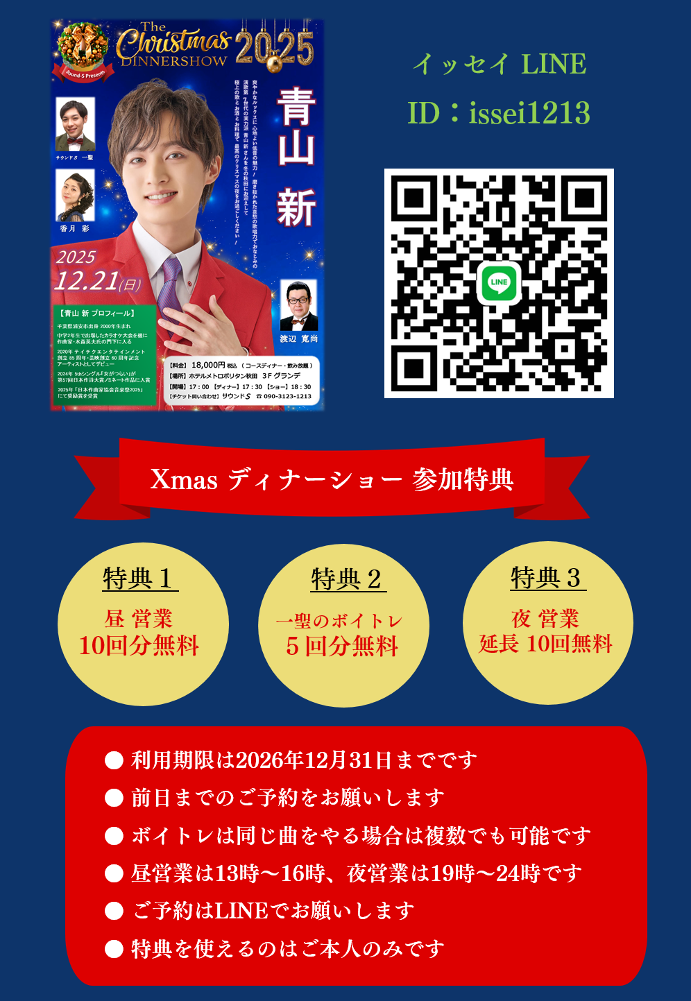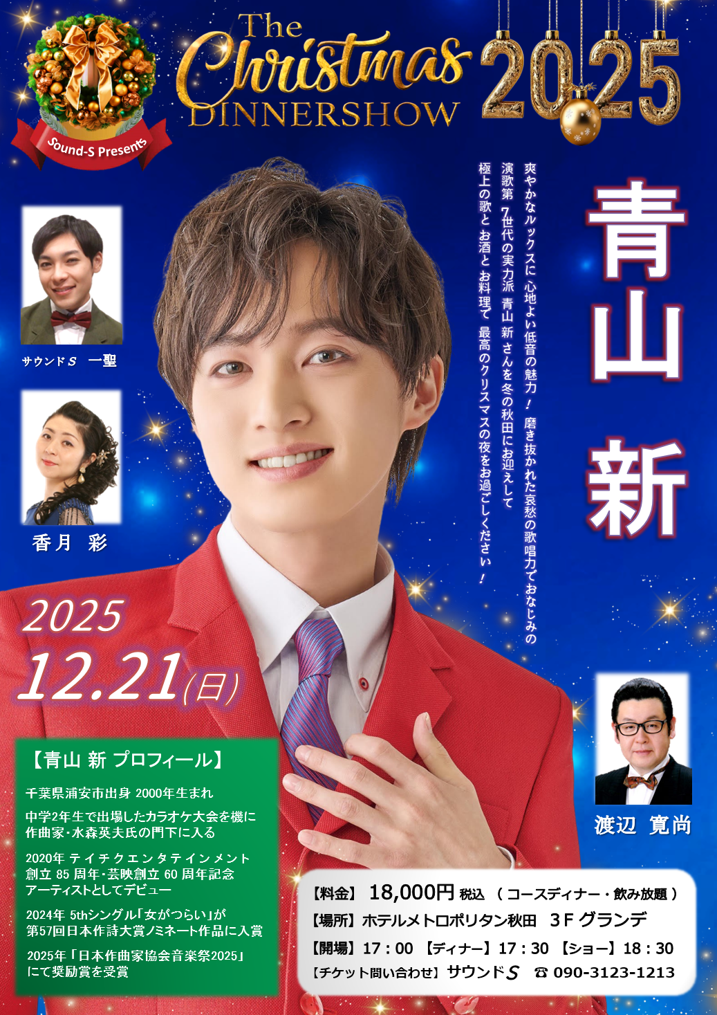 当店 サウンドS 主催で12月21日(日)に演歌第7世代の実力派 「青山 新」さんをゲストにお迎えしディナーショーを開催します!